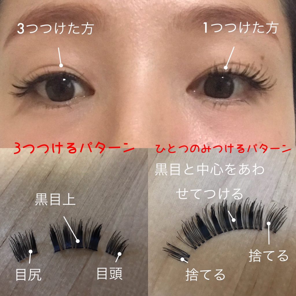 3つにパーツを分けて使うとつけまつげ本来の長さやボリュームを生かすことができます。つける手間はあるけれど一度つけたら取れる心配も少ないのがこのつけ方の良いところ。(過去に海で一日遊んでもとれなかった経験有り)