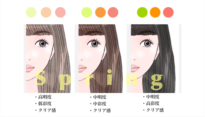 16タイプ診断をすることで、似合う色の明るさや鮮やかさがどの程度なのかまでがはっきり判ります。下の画像はスプリングに該当する人のイメージです。全員スプリングですが、少しづつ似合う色の明るさや鮮やかさなどの特徴が違います。