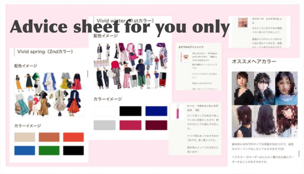 診断で実際にお会いした時の肌色や、キャラクター、ライフスタイルなどを踏まえて、お客さまだけのパーソナルカラー活用アドバイスシートを作成しています。診断後に私自身がコスメカウンターに行きお客さまに合う色のコスメを探し出してきます。(プチプラ〜デパコスまでご希望に合わせます)