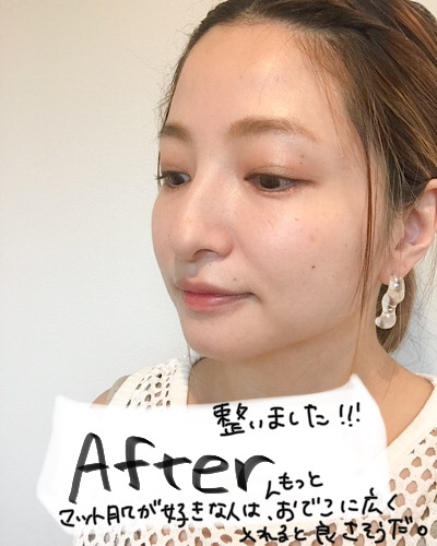 注意点が一つ。ファンデーションをしっかり塗ってる頬はムラになりました。あくまでも応急処置が良さそう。おでこと鼻筋あたりまでかな。