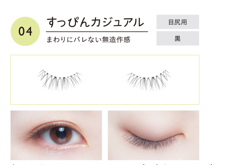 先に紹介した03番と比べてやや黒目よりの位置に付けるタイプ。そのためどちらかと言うと二重の目の方が付けやすい。目頭側と目尻側を少しづつカットするとより付けやすくなると思います。