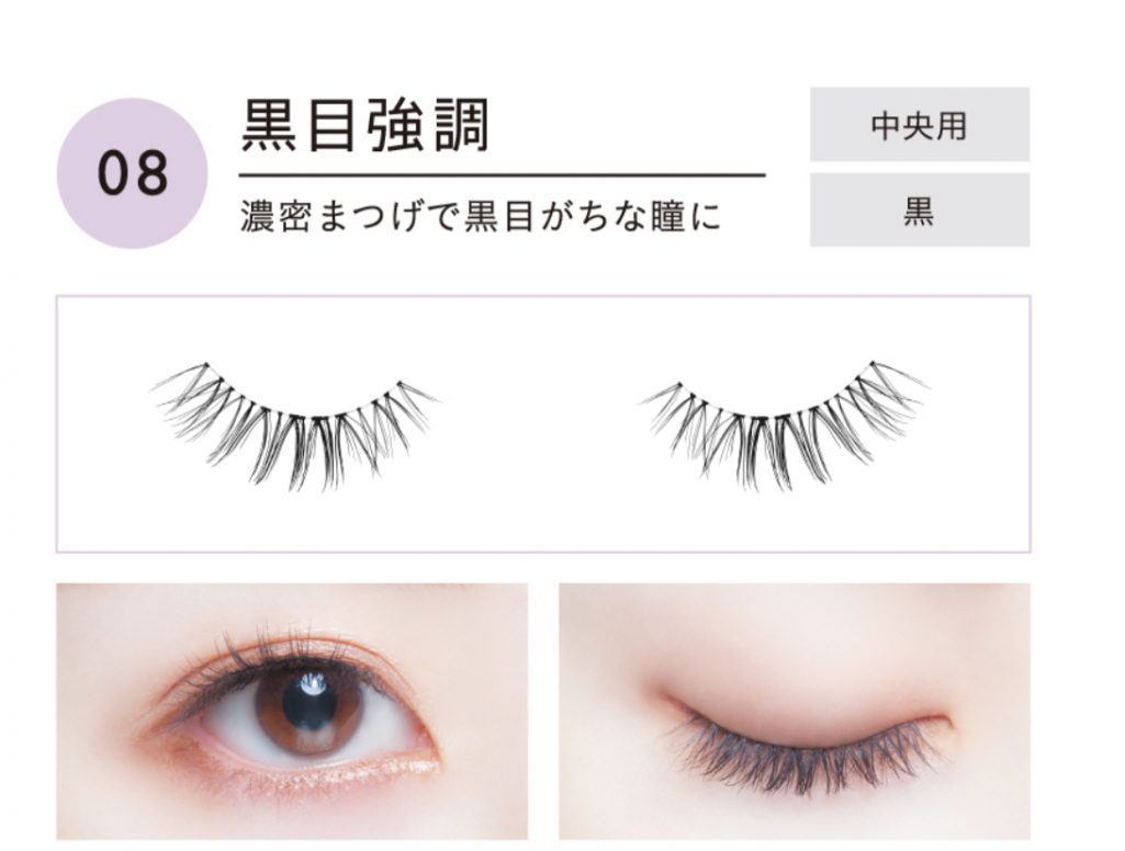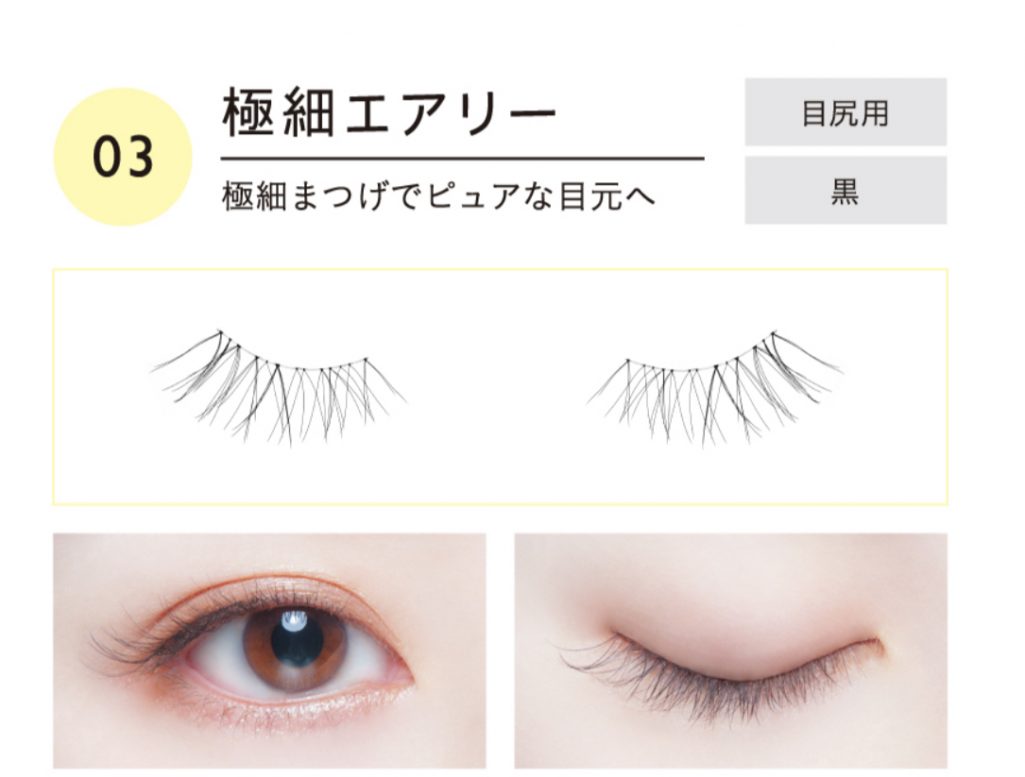 目尻側につけるタイプ。毛の色も薄い黒なので誰でも合わせやすい。とにかく迷ったらこれを選んでOK。一重の人も付けやすいと思います。目頭側を少しカットするとさらに付けやすくなる。(付けてみて取れやすかったらカットしてみて。)
