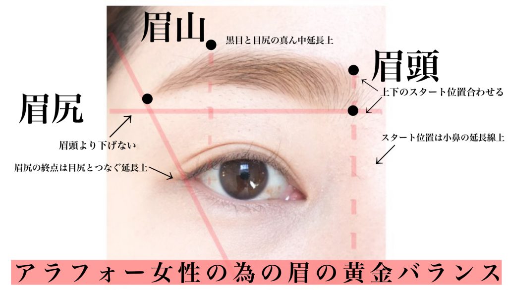 眉頭のスタート4点を黄金バランスに近づく様に揃える為には以下を意識すると良いです。