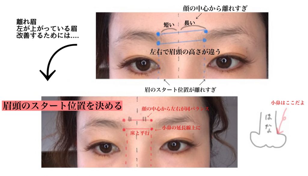 ①眉頭のスタート位置は小鼻の延長線上に