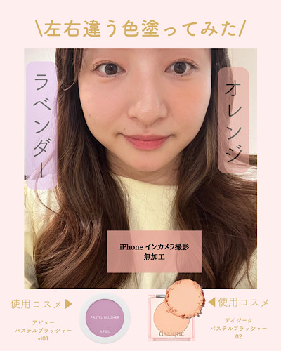 私の場合は、オレンジだとチークっぽく色が濃くついて見えるので、透明感を出したいときはラベンダーやピンクを使うことが多いです。