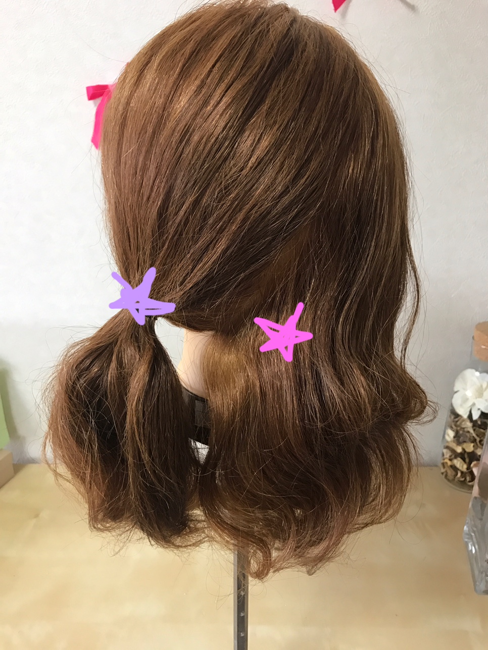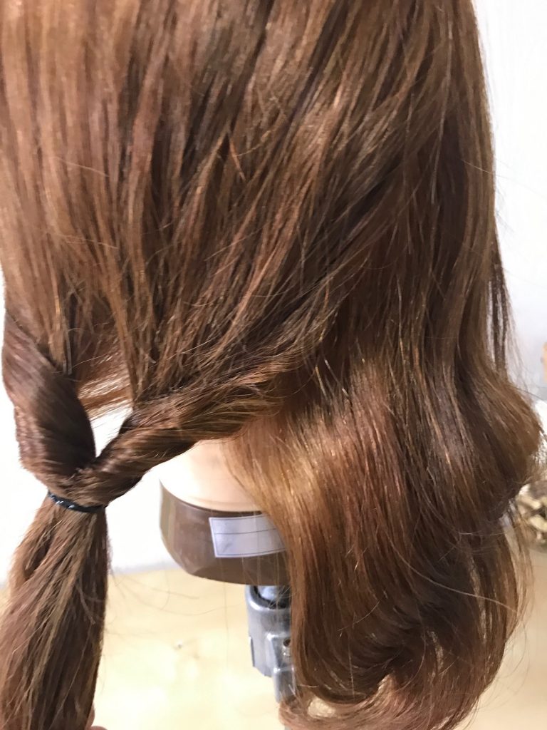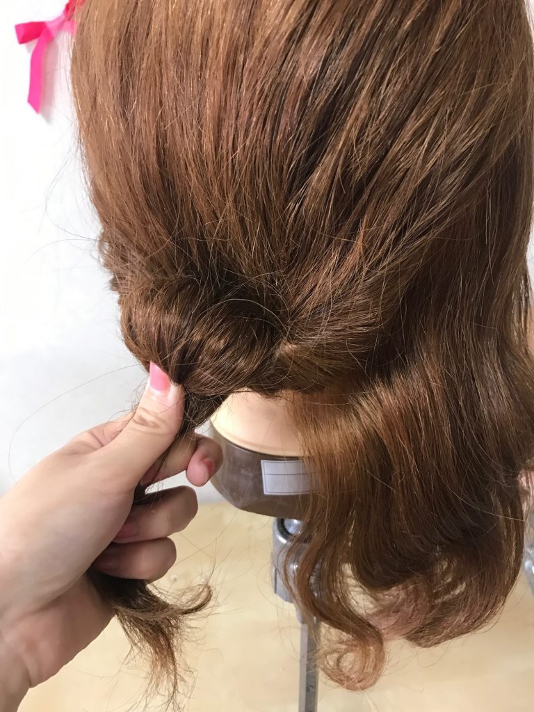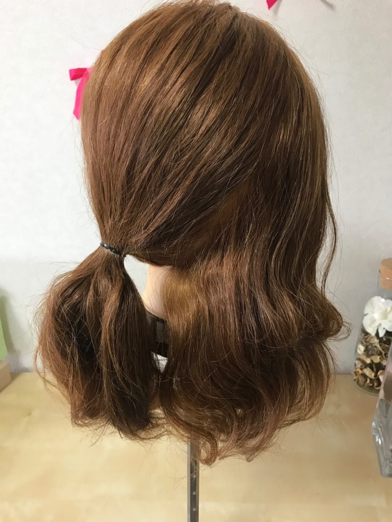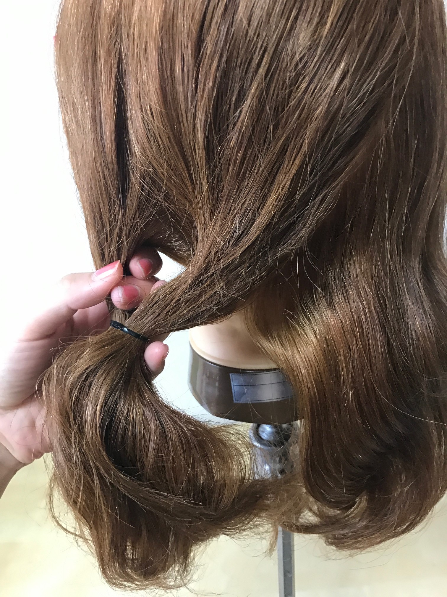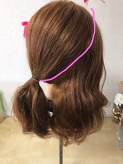 この写真の場合は右側の方が左よりも上でくるりんぱしています。ウィッグは右が下目。