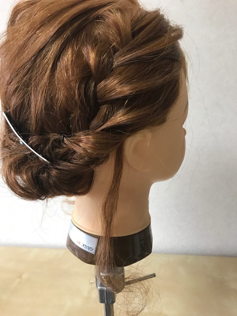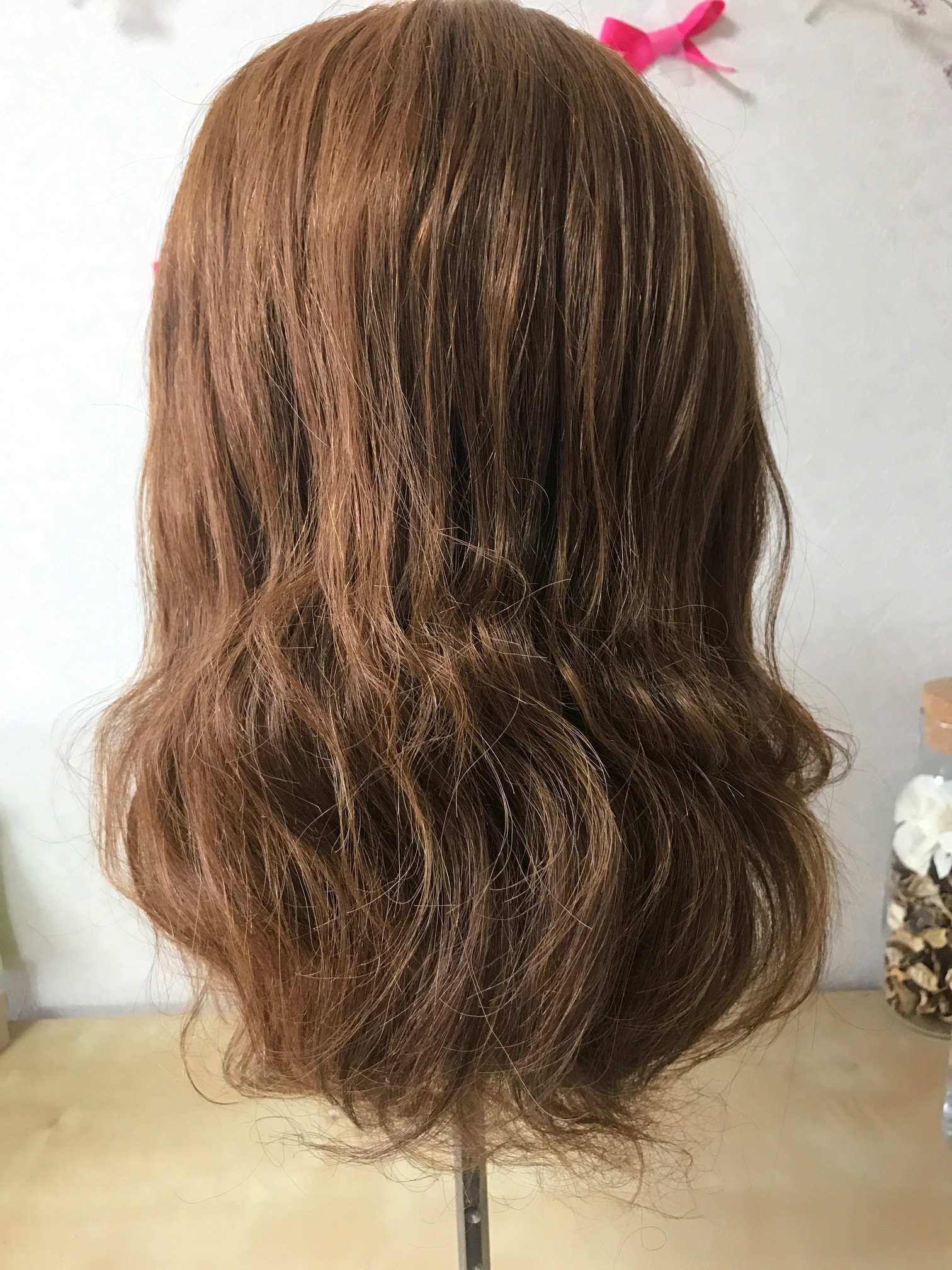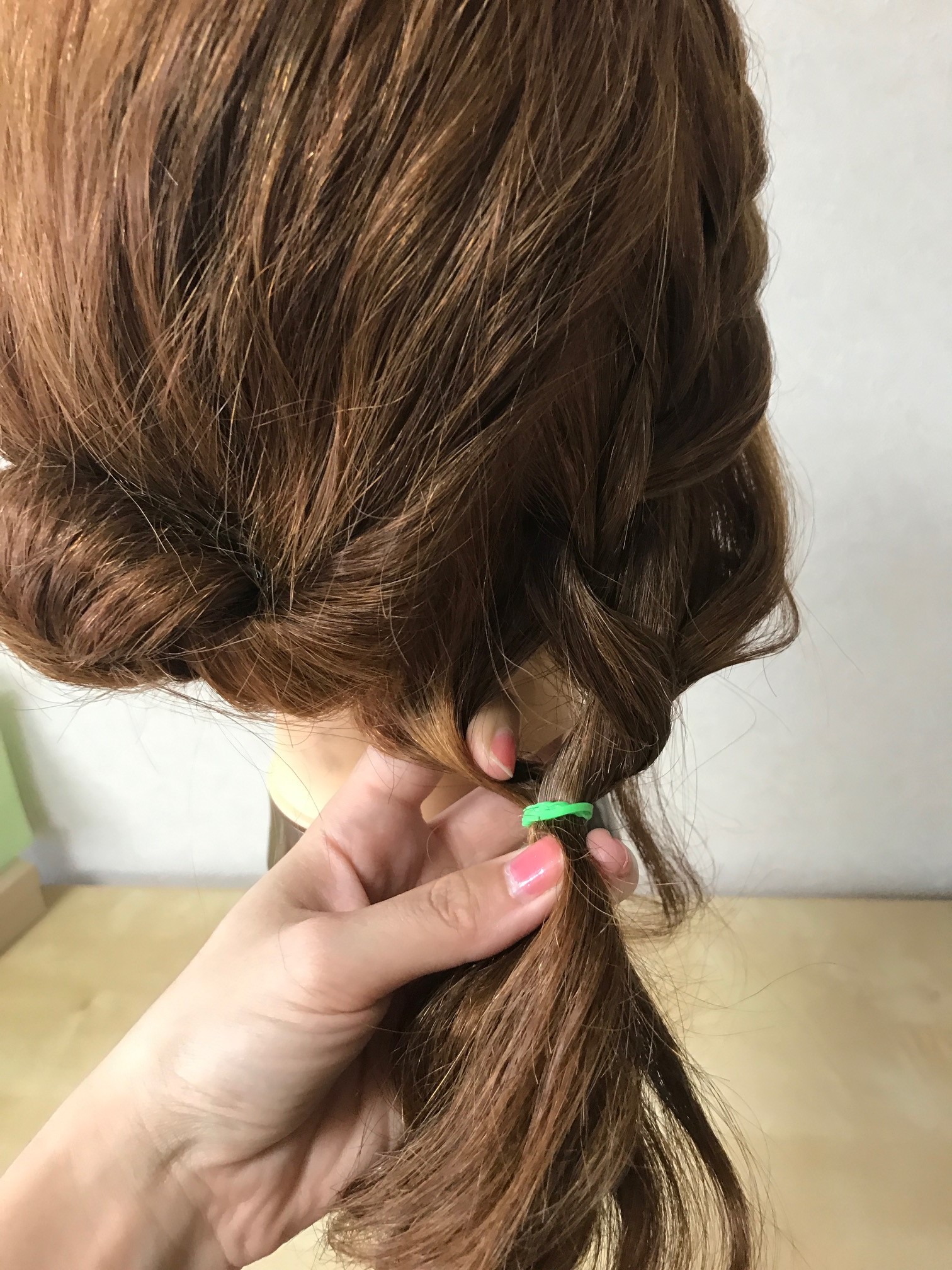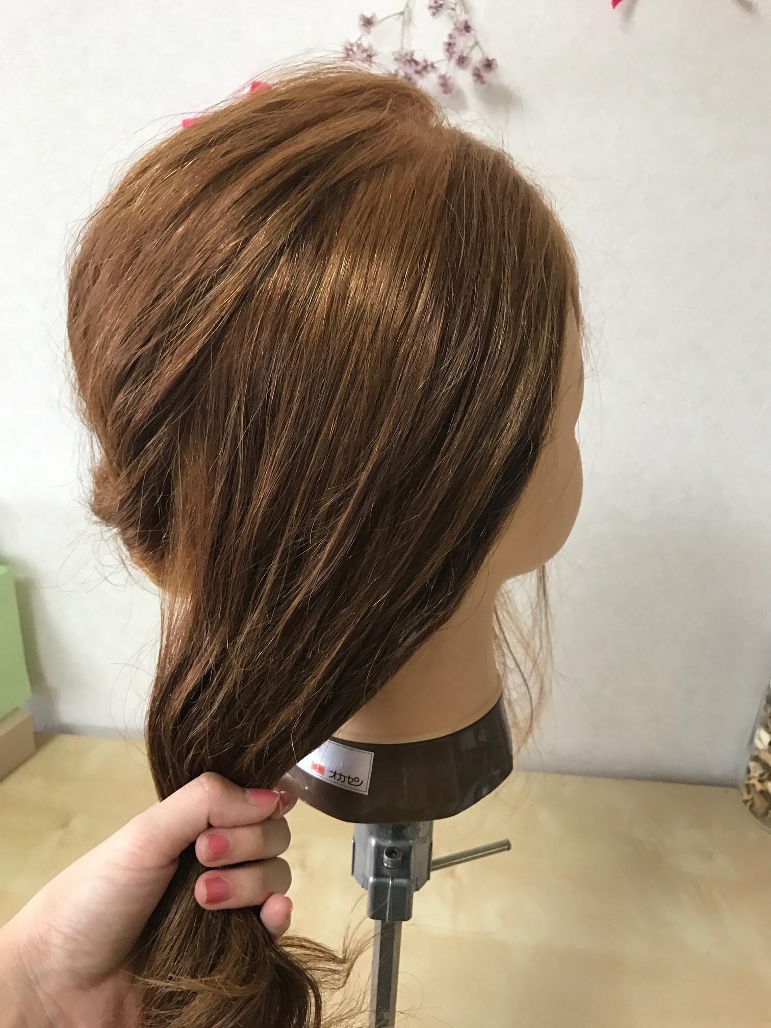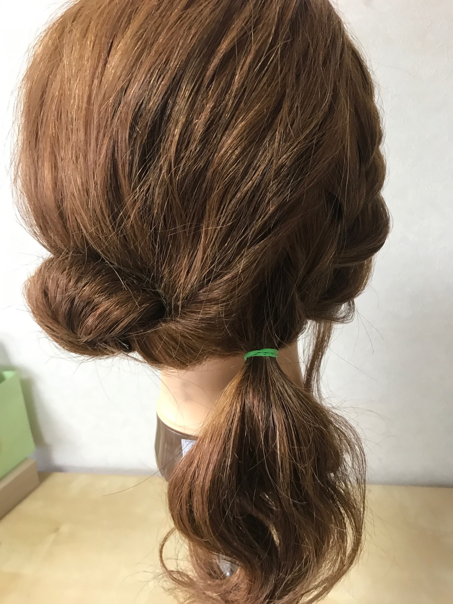 この写真の場合は右側の方が左よりも上でくるりんぱしています。ウィッグは右が下目。